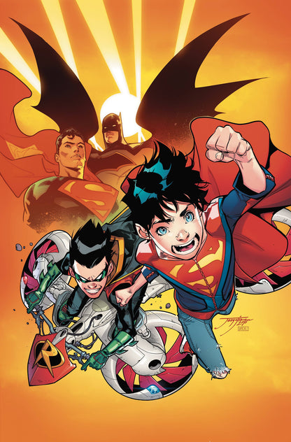"When I grow up" part one! The sons of Batman and Superman have graduated to their own monthly comic-but if they want to survive, they're going to have to share it! Writer Peter J. Tomasi (BATMAN & ROBIN, SUPERMAN) teams with rising-star artist Jorge Jimenez (EARTH 2) to bring you the adventures of the World's Smallest. This debut issue looks at the lives of Robin and Superboy and their destiny to follow in their fathers' footsteps, while we meet a new villain whose ascension parallels the boys' own understanding of their powers-except that he believes it's his right to rule over every being on the planet!